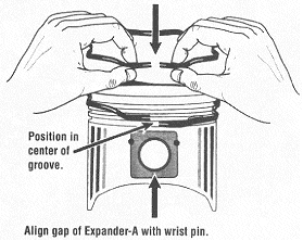 Gently separate and slide down over piston groove. Position in center of groove and align gap of Expander-A with wrist pin.
