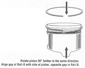 Place over Expander-A and between Spacer-C and top of ring groove. Install in spiral motion. Rotate piston 90o further in the same direction as in #3 above. Align gap of Rail-D with side of piston, opposite form Rail-B.